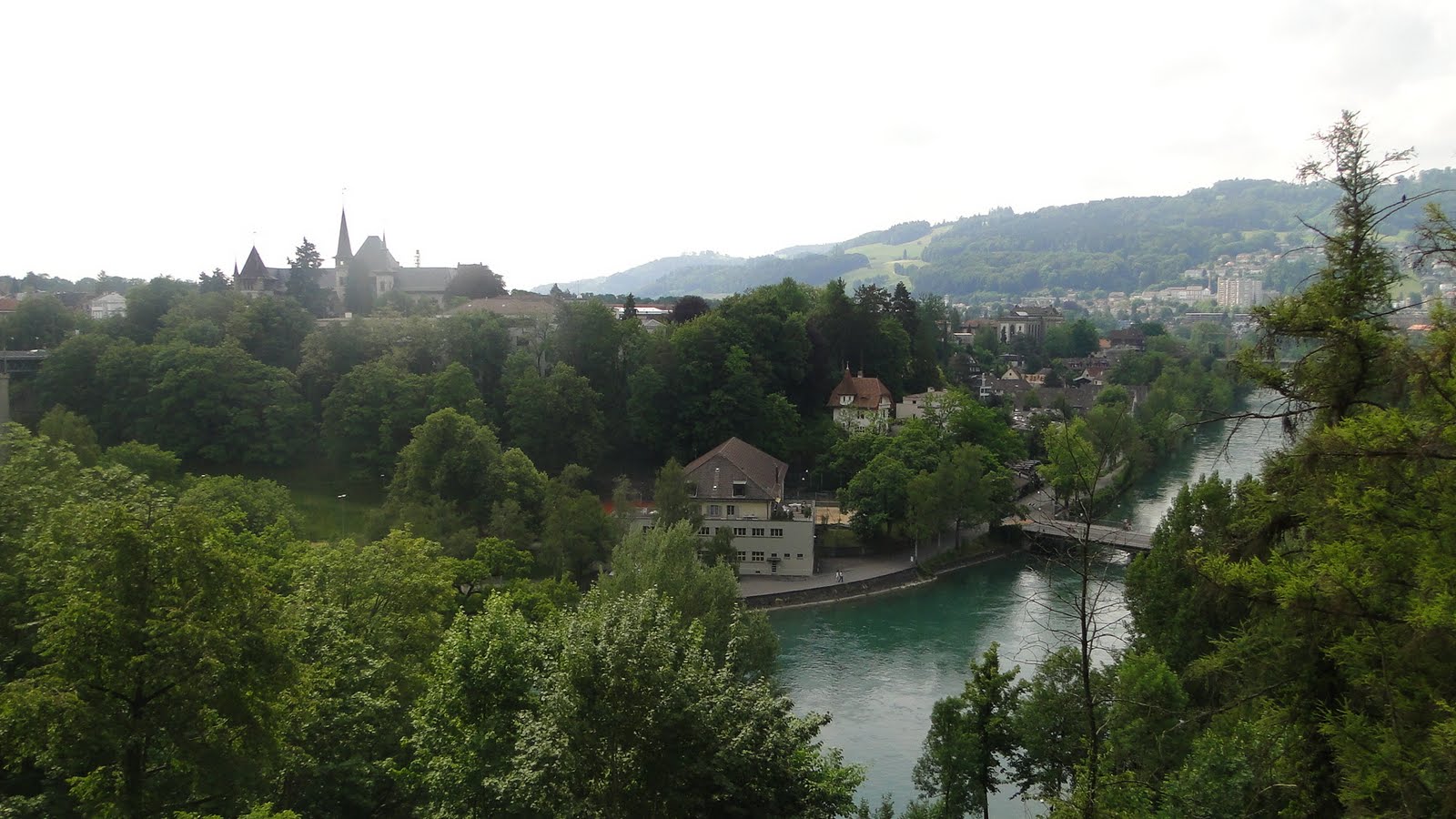 Passeando pelo parque Kleine Schanze, ao subir para o terraço do Parlamento nos deparamos com esta vista magnífica da cidade e do rio Aar. Maravilha, não? Observem a cor azul-esmeralda da água do rio.